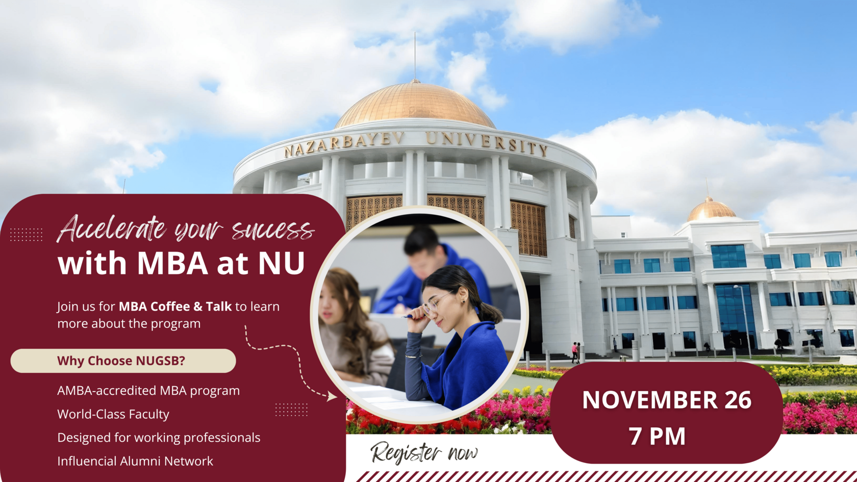 Назарбаев Университеті Жоғарғы Бизнес мектебінің Іскерлік әкімшілендіру магистрі (NUGSB MBA) бағдарламасы сіздің кәсіби мақсаттарыңызға жетуге қалай көмектесетінін білуді жіберіп алмаңыз.